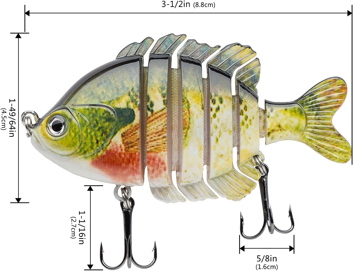 Introducing the BASSDASH SwimPanfish Multi Jointed Panfish Bluegill Swimbaits, the ultimate fishing lure designed to attract bass and panfish with its lifelike action and vibrant colors. Measuring 3.5 inches and weighing 0.85 ounces, this hard topwater crank lure mimics the natural movement of baitfish, making it irresistible to hungry predators.