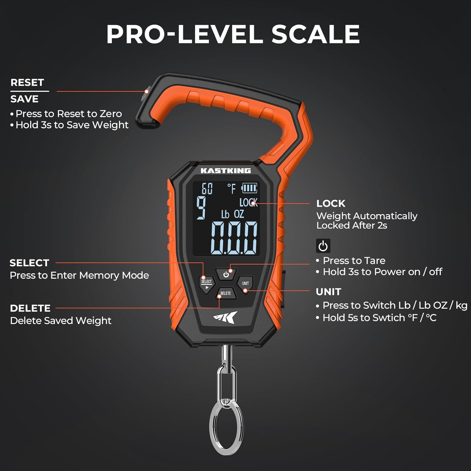 KastKing Weighmaster Mechanical-Digital Fishing Scale with Lip Gripper, 120 lb Capacity, 2.5″ Backlit Display, High-Precision Sensor, 9 Weight Memory, Temperature Detection, IPX6 Waterproof