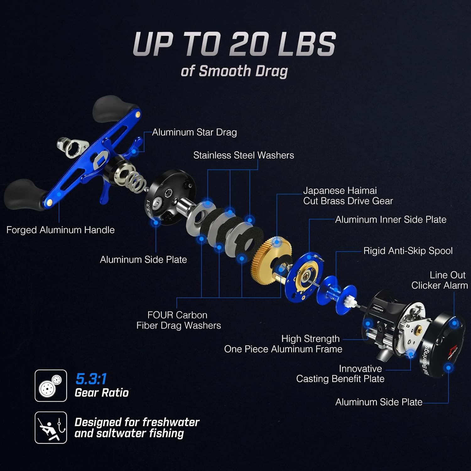 Experience smooth and powerful retrieves with the advanced gear system that delivers exceptional torque and speed, making it perfect for targeting catfish, musky, bass, and pike. The precision-engineered drag system provides consistent pressure, allowing you to battle even the toughest fish with confidence.