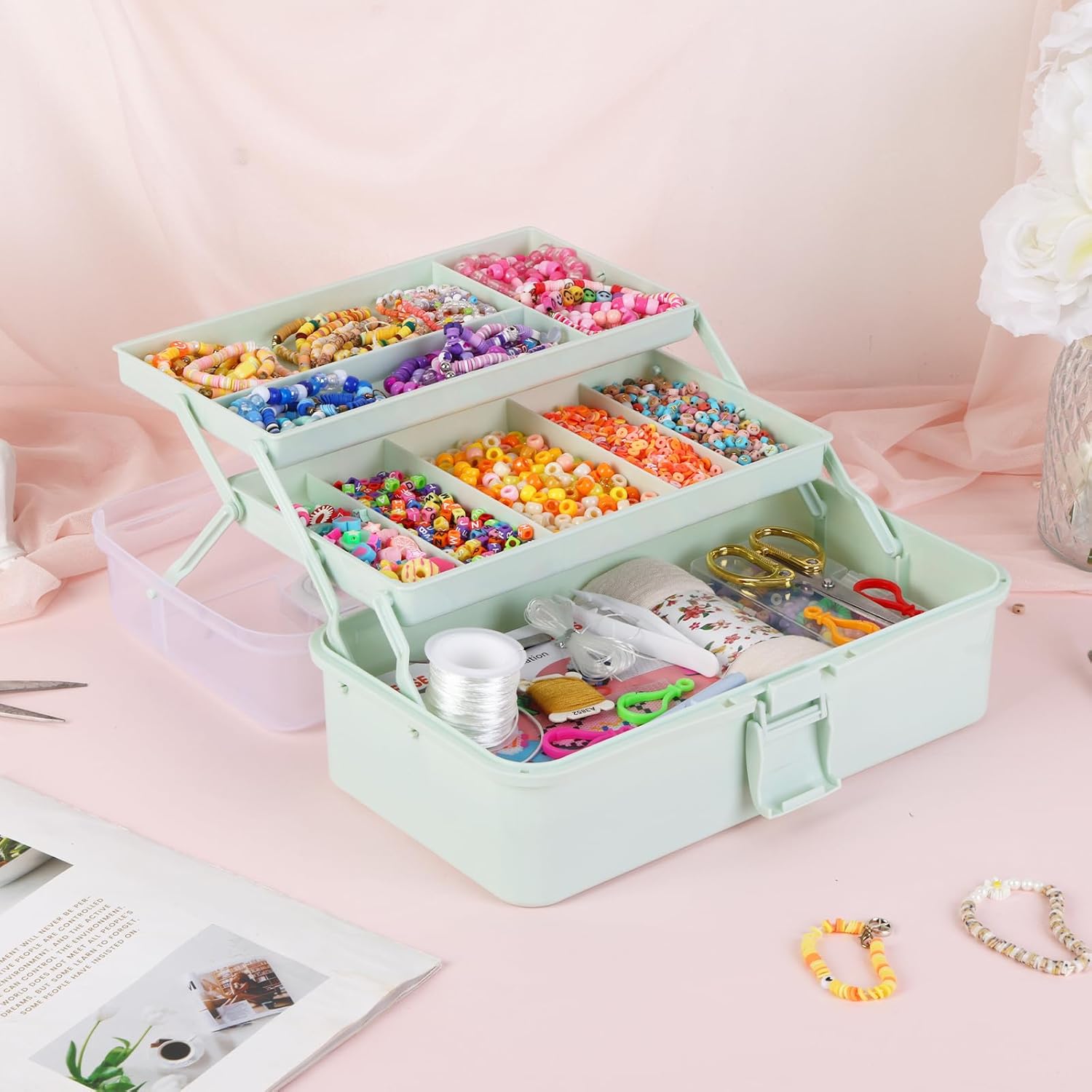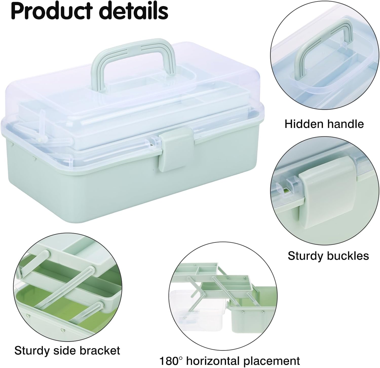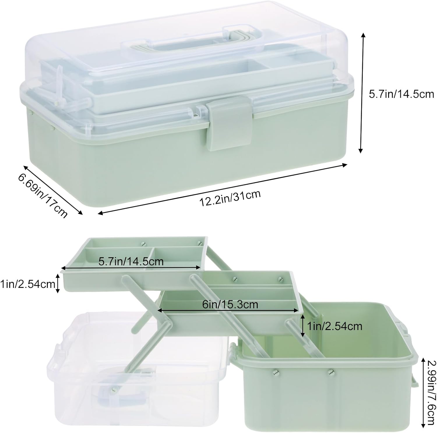 Introducing the Tackle Box, Craft Organizers and Storage 3-Layer Portable Folding Toolbox in a stylish Haze Green color. Measuring 12.5 inches, this versatile plastic tool box is designed to keep your essentials organized and easily accessible. Whether you’re a sewing enthusiast, a medicine organizer, an artist, or someone who loves to keep hair accessories and nails neatly stored, this toolbox is perfect for you.