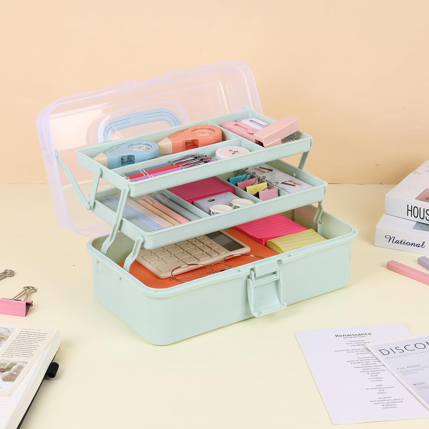 Tackle Box, Craft Organizers and Storage 3-Layer Portable Folding Toolbox, Plastic Tool Box with Handle for Sewing Supplies, Medicine, Art Supplies, Nails and Hair Accessories (Haze Green, 12.5inch)
